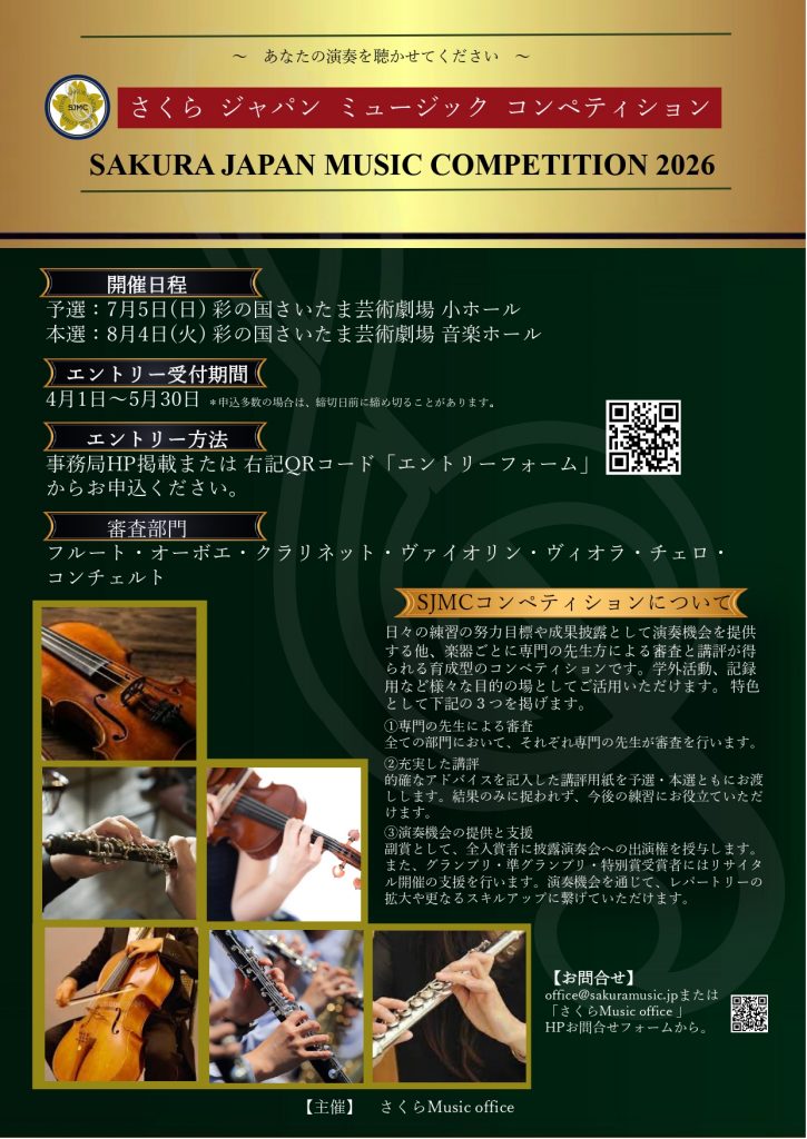 この度、新たなステージとして、「ヴィヴァルディ四季 コンクール」を開催する運びとなりました。バロック音楽の傑作として名高いヴィヴァルディの四季を課題として、⾼度なアンサンブル能⼒育成とソリスト経験の貴重な機会を提供したいという目的からこのコンクールを立ち上げることとなりました。⽇本⾳楽界を最先端で牽引する指導者・トップアーティストを審査員に迎え、本選では審査員特別編成アンサンブルと夢の共演という画期的なコンクールです。さくらMusic officeは2013年発⾜以来、習学段階に応じた場の提供、将来に繋がる取り組みに尽⼒しております。基礎とアンサンブル経験のための弦楽器講習会「彩の国String Academy」、⾳階を予選審査課題にもちいた「彩の国String Competition」などを通じ、⾳階練習の重要性の発信とアンサンブルの楽しみを実感していただくことに努め、また、2018年から「Young Artist⽀援プロジェクト」を開始、レパートリー拡⼤や演奏実績作りなどを⽬的としたリサイタル⽀援を⾏い、これまで延べ50名以上の若⼿演奏家の育成に貢献してまいりました。ヴィヴァルディ「四季」へのチャレンジで演奏家としてさらなるスキルアップ、大きな自信に繋がる絶好の機会となるこに願い込めて開催いたします。