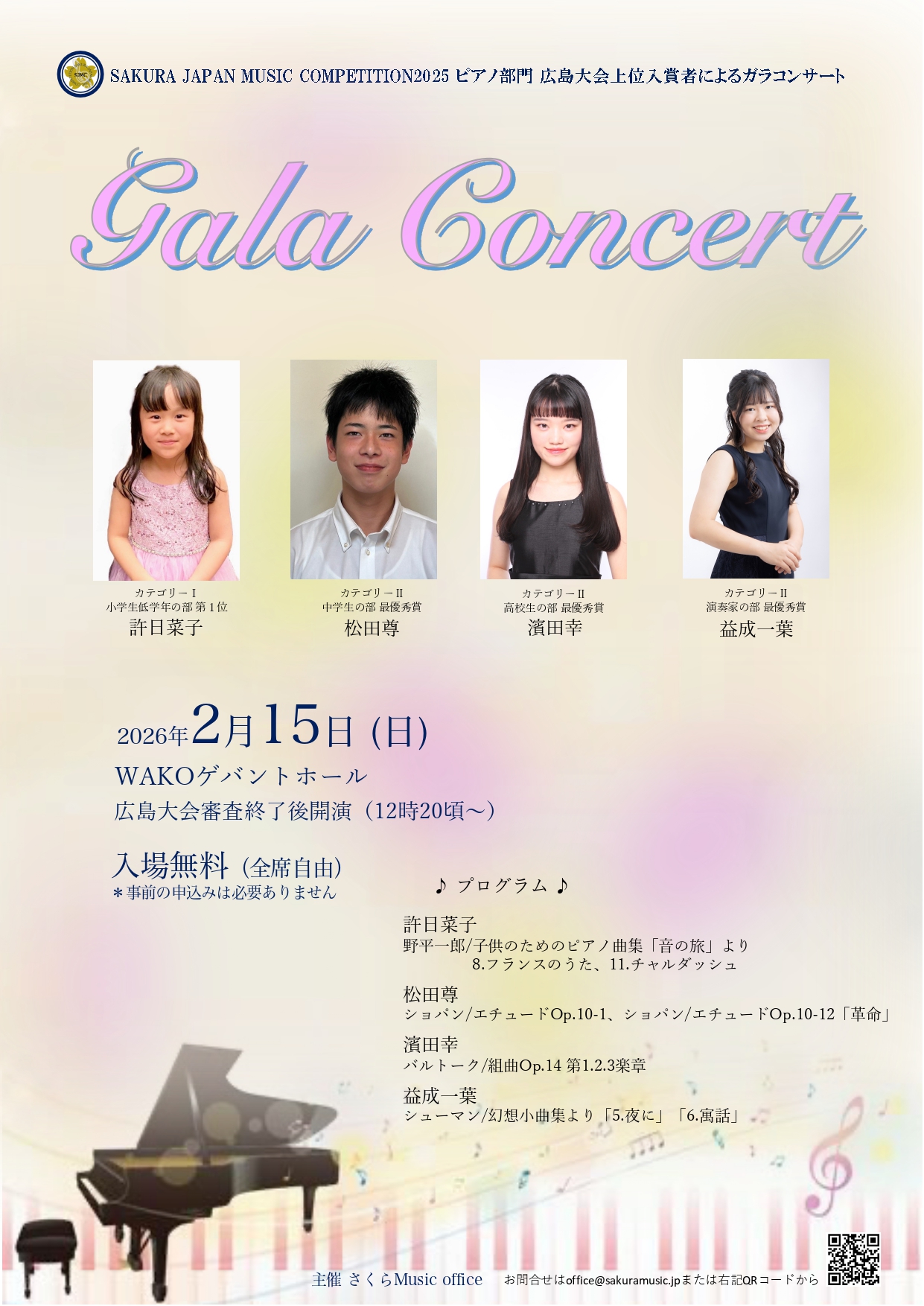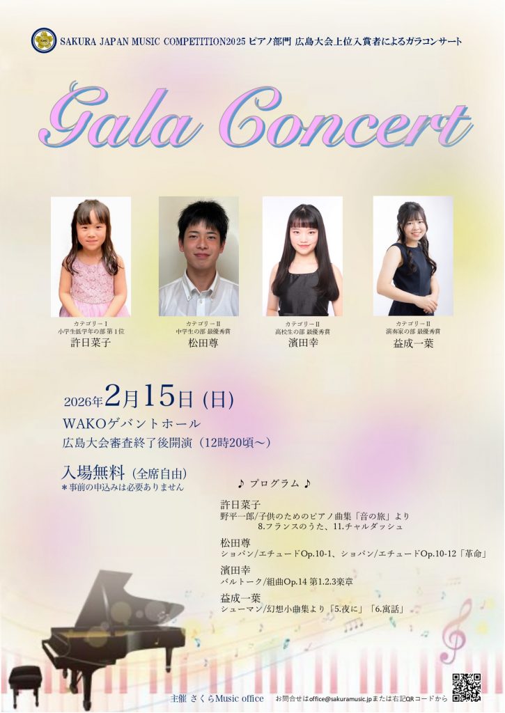 SAKURA JAPAN MUSIC COMPETITION 2026 ピアノ部門 広島大会 2025年12月2日未分類admin エントリーは締め切りました。 ご参加の皆さまへ Post Views: 196
