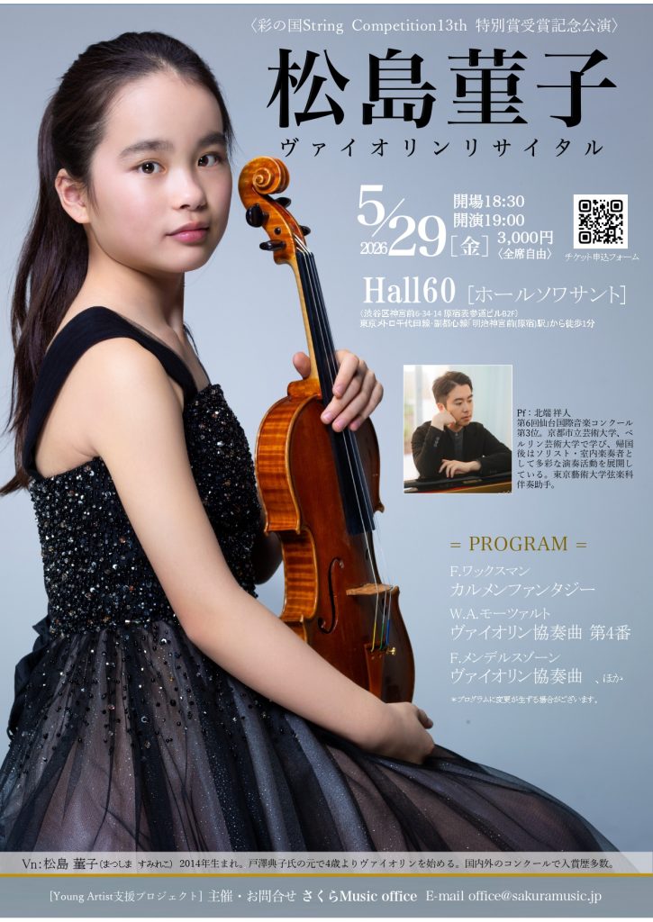 〈彩の国String Competition 13th 特別賞受賞記念公演〉松島董子ヴァイオリンリサイタルのお知らせ 2026年3月26日Announce、未分類admin 〈彩の国String Competition13th 特別賞受賞記念公演〉松島 菫子 ヴァイオリンリサイタル2026年5月29日(金)開場18:30/開演19:00ホール60 (ホールソワント)チケット ¥3000(全席自由) チケットお申込みフォーム Post Views: 16